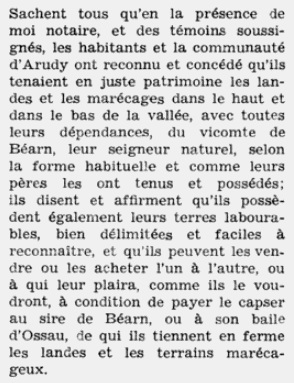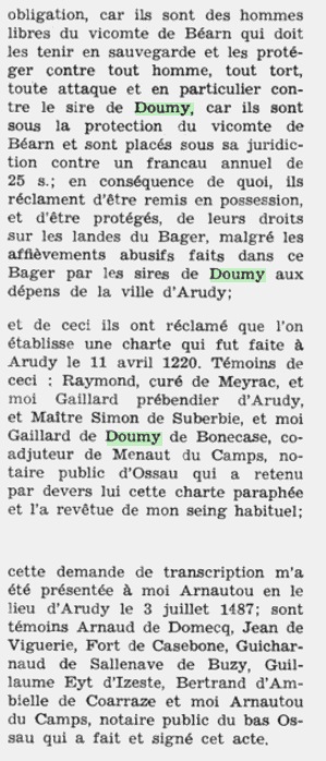 La charte sur la basse vallée d'Ossau au Moyen Âge du 11 avril 1220 témoigne (déjà) des rapports conflictuels entre les Ossalois et les seigneurs de la plaine (ici le sire de Doumy) où les "Ossalois demandent protection au vicomte de Béarn contre tout homme, tout tort et toute attaque et en particulier contre le sire de Doumy ... pour les affièvements abusifs aux dépens de la ville d'Arudy"... (affièvement : terme du moyen âge venant du mot fief, peut-être synonyme de bail).